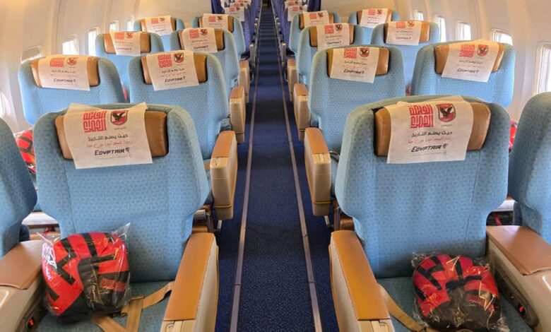 هذا وتزينت مقاعد الطائرة بشعار الاحتفالية ” حيث يصنع التاريخ رحلة المجد تبدأ من هنا ” في إشارة للقلعة الحمراء النادي الأهلي كما قدمت مصرللطيران كافة تسهيلات السفر اللازمة لضيوف المارد الأحمر المشاركين في هذا الحدث الرياضي الكبير بما يليق بمكانة جمهورية مصر العربية في استضافة الأحداث الدولية .