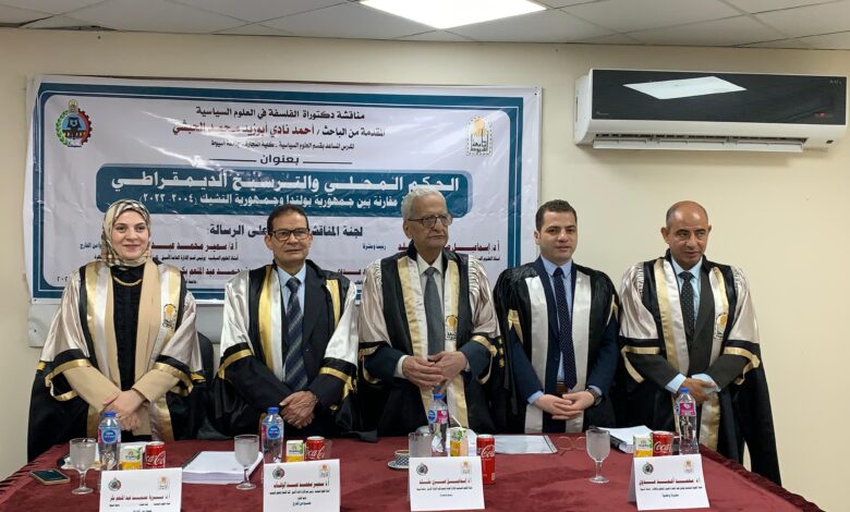 شهدت كلية التجارة بجامعة أسيوط، يوم الأربعاء الموافق 18 يونيو 2025، مناقشة رسالة دكتوراه مقدمة من الباحث أحمد نادي أبو زيد محمد الحبشي، المدرس المساعد بقسم العلوم السياسية، وذلك لنيل درجة دكتوراه الفلسفة في العلوم السياسية.