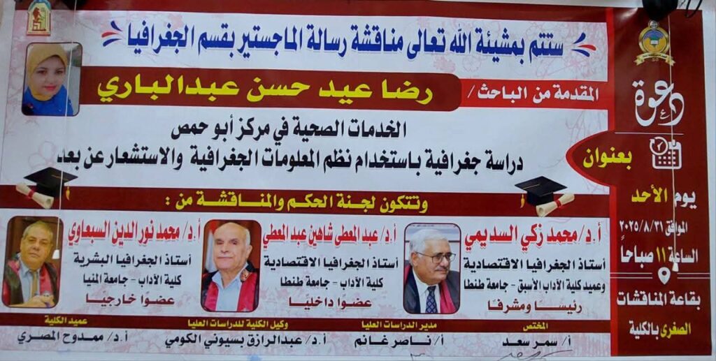 شهدت كلية الآداب – جامعة طنطا مناقشة رسالة الماجستير المقدمة من الباحثة رضا عيد حسن عبد الباري (رضا عيد) بقسم الجغرافيا، تحت عنوان: